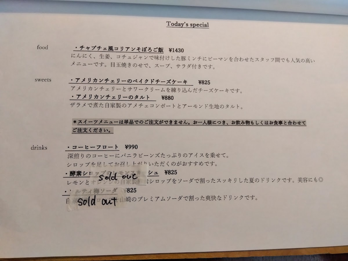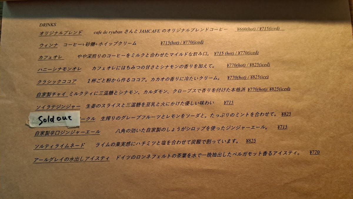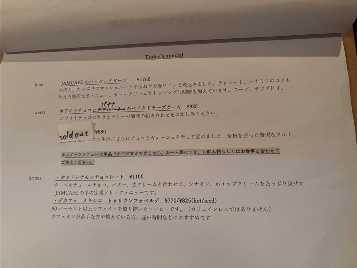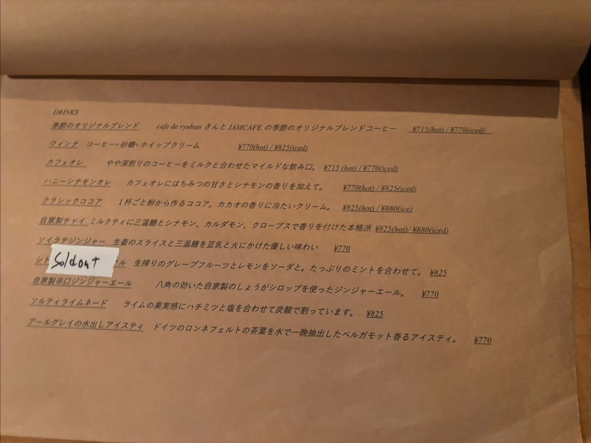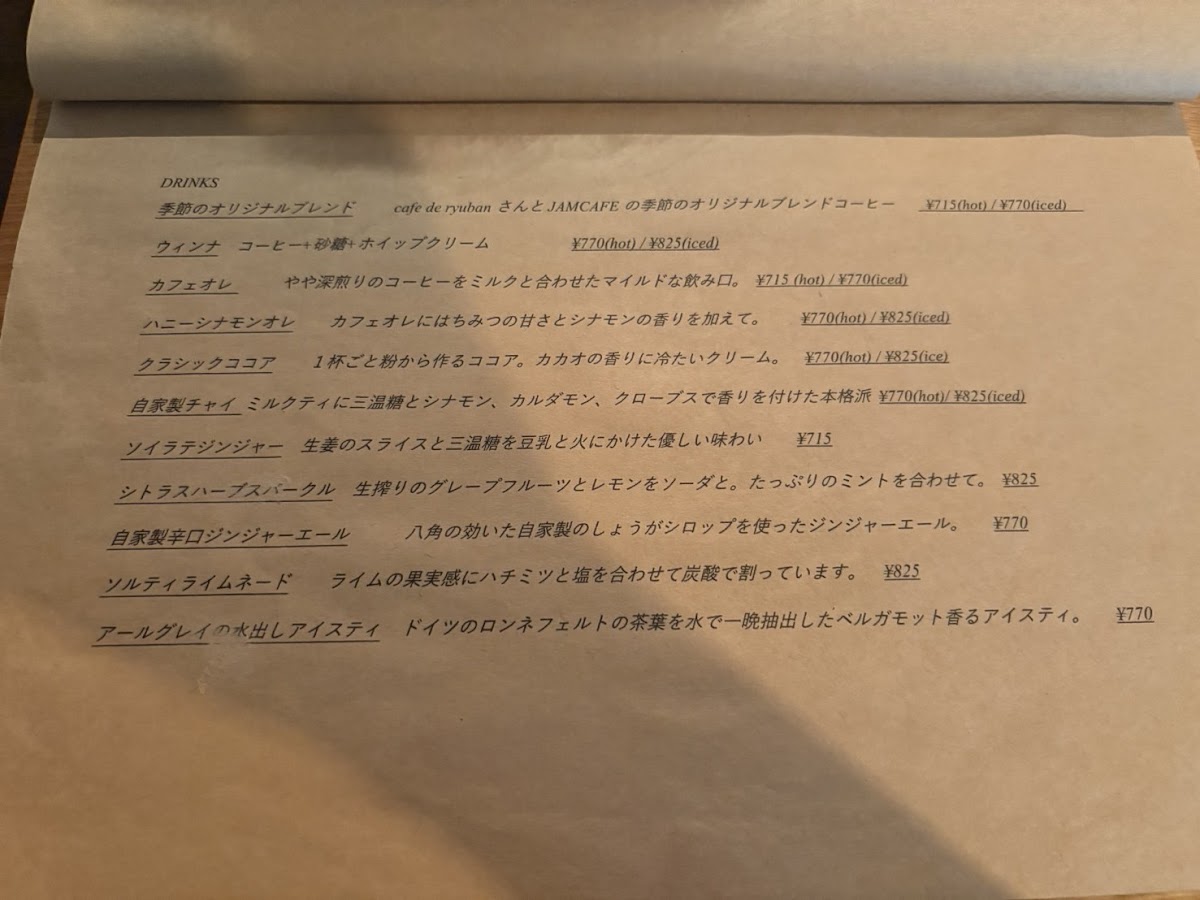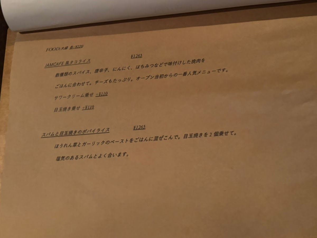 The menu at Jam Cafe offers a delightful range of dishes, showcasing both savory and sweet options that are perfect for any time of day. For those looking for something sweet, the 抹茶とホワイトチョコのベイクドチーズケーキ (matcha and white chocolate baked cheesecake) stands out with its rich, creamy texture and the perfect balance of earthy matcha and smooth white chocolate. On the savory side, the スパムと目玉焼きのポパイライスとソルティライチスパーリング (Spam and fried egg on Popeye rice with salty lychee sparkling) is a unique, flavorful dish that combines salty Spam with the freshness of a fried egg, all served over a hearty bed of rice. A refreshing drink to pair with this is the ハニーシナモンオレ (honey cinnamon latte), offering a sweet, spiced kick that complements the meal. The スコーン (scone) is another highlight, perfectly crisp on the outside while remaining soft and fluffy on the inside-ideal when paired with a cup of coffee or tea. For a more substantial dish, the チャプチェ風コリアンそぼろご飯 (Japchae-style Korean seasoned rice) offers a deliciously savory combination of seasoned rice and Korean-inspired flavors. Another popular choice is the アメリカンチェリーとバニラのベイクドチーズケーキ (American cherry and vanilla baked cheesecake), a light yet indulgent dessert that combines the tartness of cherries with the creaminess of vanilla and cheese. Whether you’re after a quick snack, a hearty meal, or a sweet treat, Jam Cafe’s menu has something to satisfy every craving.